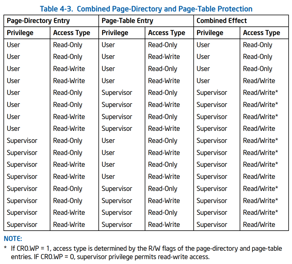 CPU将在Page条目(PDE)或Page条目(PTE)中使用最严格的特权。如果一个PDE拥有Supervisor特权,那么下面的所有页面表都将拥有Supervisor特权,不管PTEs使用什么。如果PDE具有用户权限级别,那么PTE的保护级别将决定最终的权限级别。
