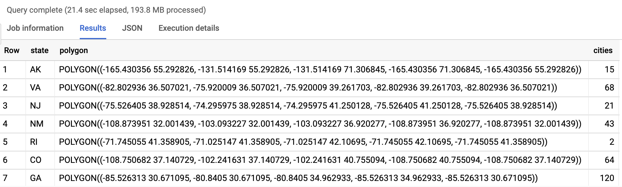 GROUP BY state这个查询的预期结果是一个按州分组的包围框列表,用于覆盖美国所有的城市地区。