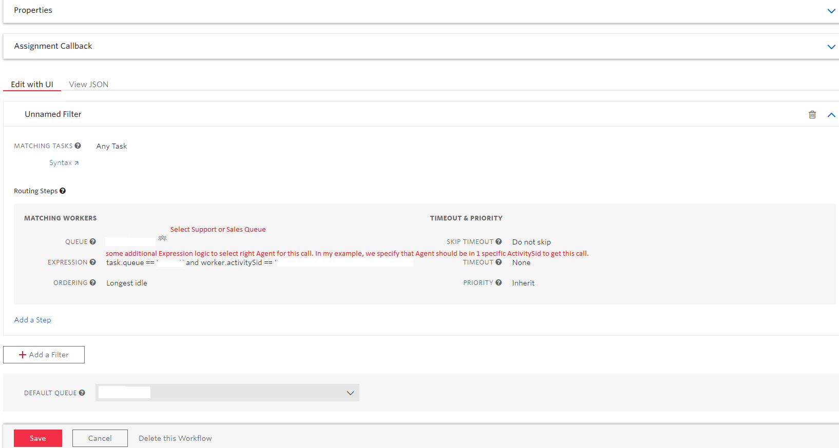 1)您不需要使用TaskRoute Workflow callback is: /assignment。您可以在工作流配置页面上设置所有需要的内容: