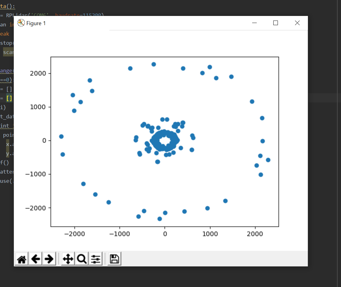 来自传感器的原始数据以数组的形式出现,该数组包含大约100组以下数据:(quality,theta,r)。我的代码检查质量是否良好(15是最大的),然后继续绘制数据集,每七个实例清除数据数组,以消除旧数据。