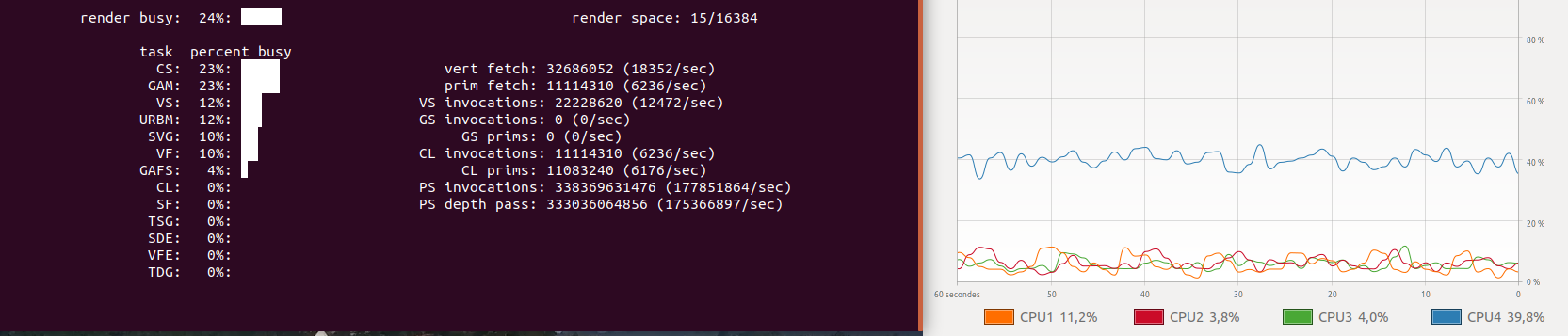 正如我们在下面的屏幕截图中看到的那样,对于这种任务来说,CPU负载(右)太高了,我们可以看到GPU负载(左)几乎为零。