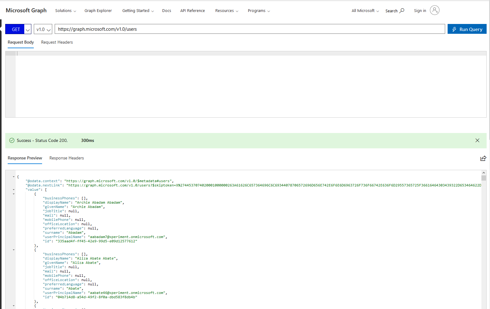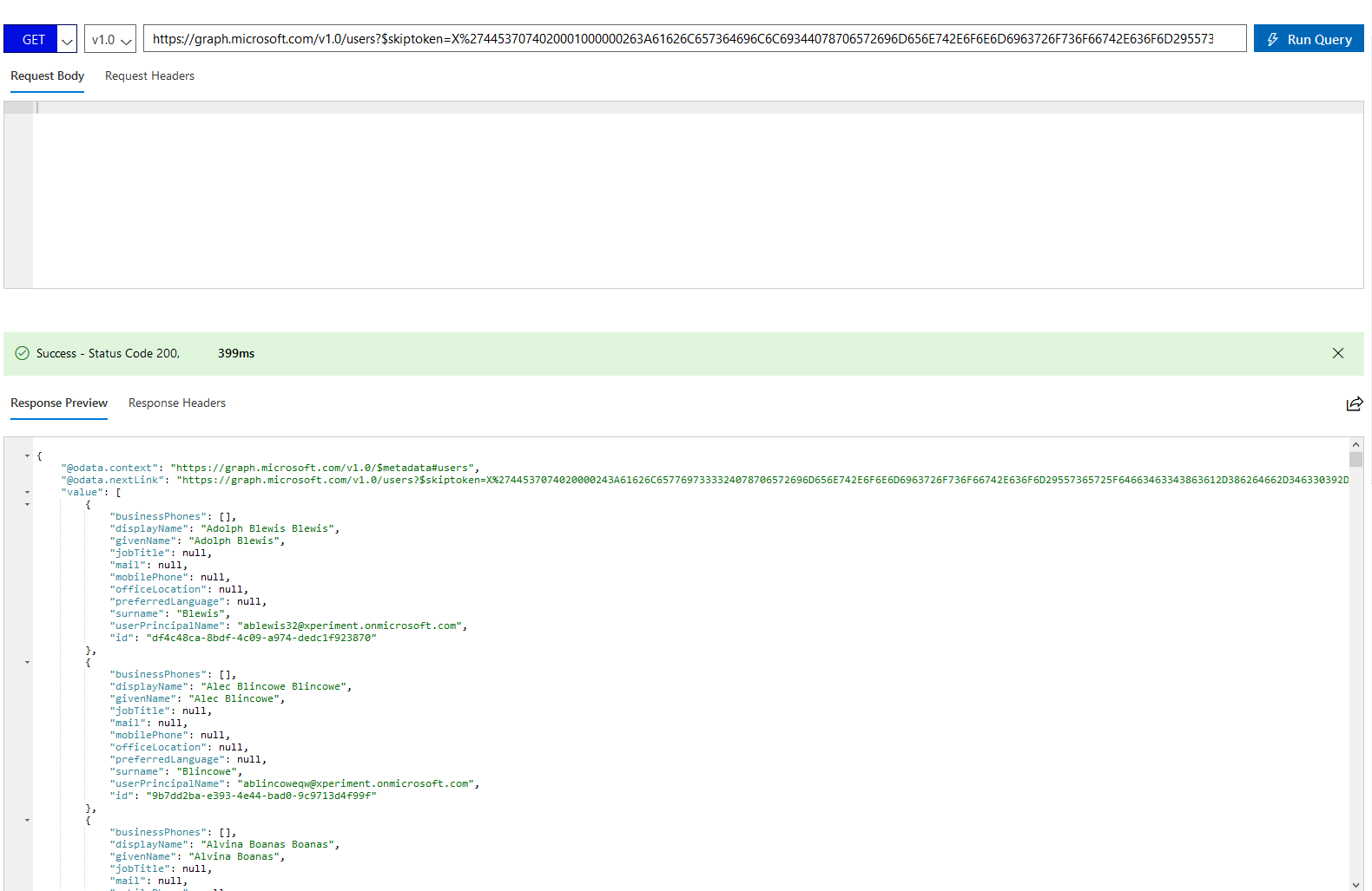 Microsoft以分页格式返回用户,因此要获得下一个用户列表,您必须查询当前响应的@odata.nextLink中提到的url,这将为您提供下一组用户。