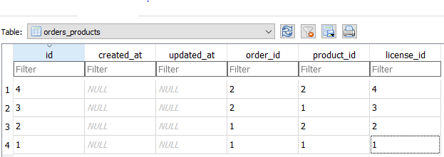 我有一张orders_products桌。一对多的关系。一个订单可以有多个产品。每个许可证都是定购产品独有的。因为每个许可证都是为给定的产品唯一生成的。