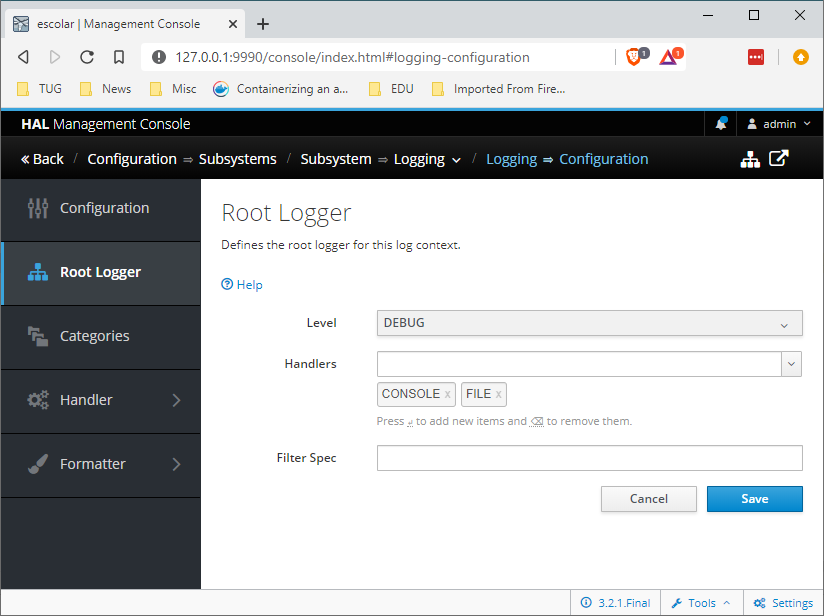 例如,我可以手动转到这里:http://127.0.0.1:9990/console/index.html#logging-configuration,然后手动将日志记录从默认的信息级别更改为调试: