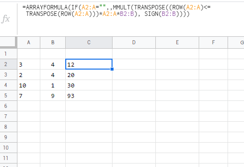 5 | 7 9 63 93 63 我可以用ARRAYFORMULA在细胞E2 (特别是ARRAYFORMULA(A2:A5*B2:B5))中进行增殖。是否可以在单元格ARRAYFORMULA中使用F2 (或替代工具)来显示累计总数?