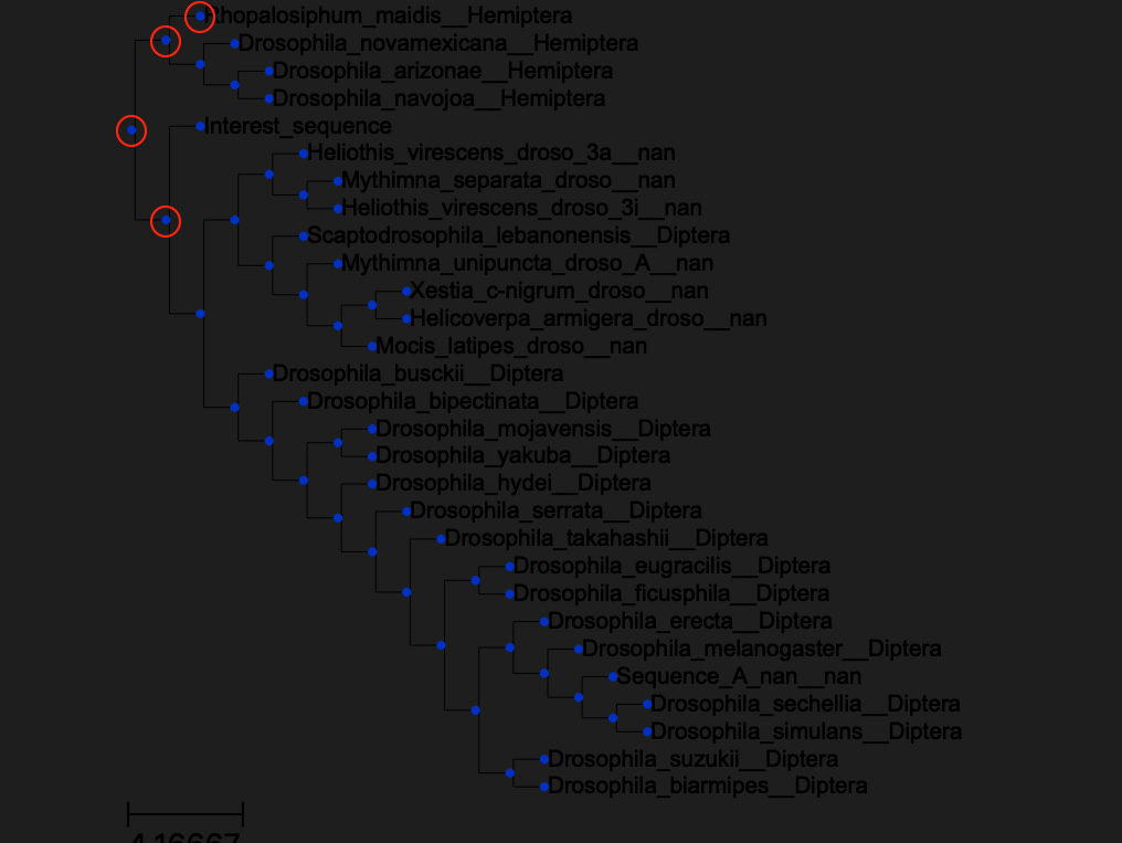 Species5_order5 3.0 4.0 4.0 2.0 0.0对于发布的更新,我没有看到任何问题。它似乎提供了正确的结果。下面是由ete3呈现的树(我突出显示了从Interest_sequence到Rhopalosiphum_maidis_Hemiptera之间的4个跳数):