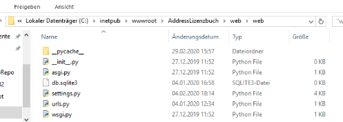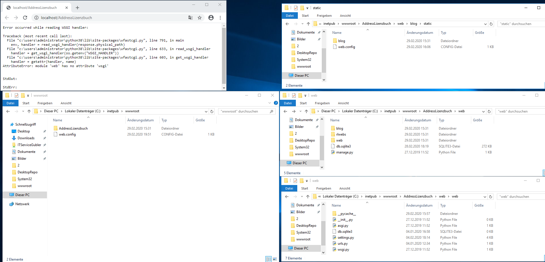 问题是,wfastcgi.py正在寻找C:/inetpub/wwwroot/AddressLizenzbuch/web/wsgi.py,但这条路径显然不存在。在删除非必要目录AddressLizenzbuch之后,您的配置文件应该包括这一行。