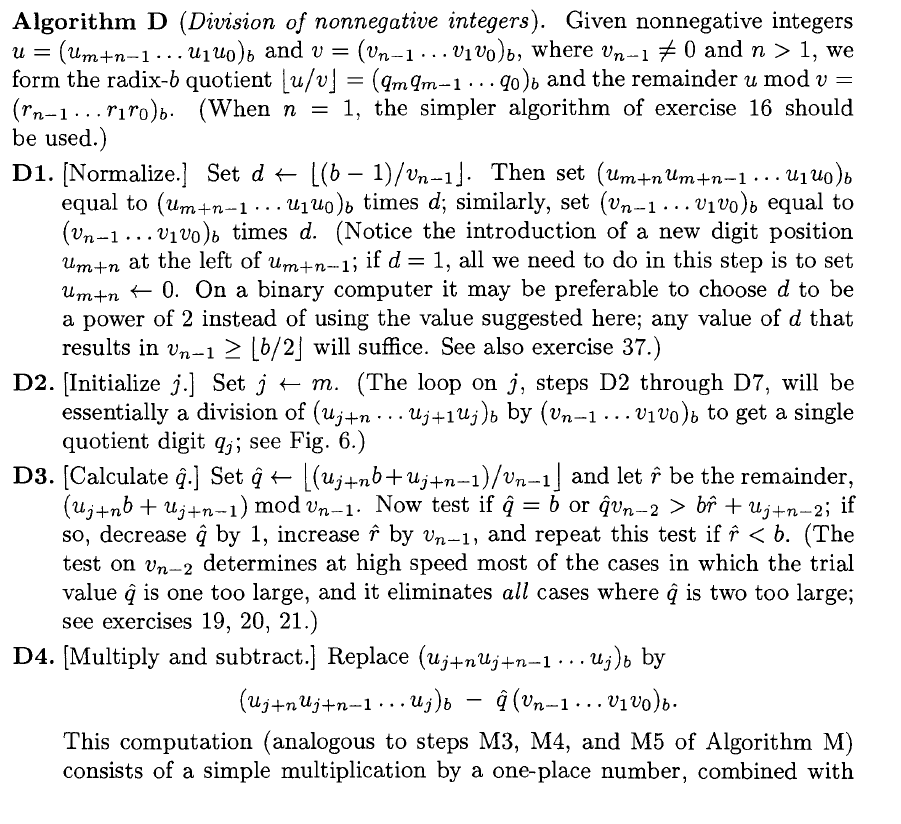 让我们假设基是2^32 (也就是说,我们使用的是无符号32位数字)。让u = [238157824, 2354839552, 2143027200, 0]和v = [3321757696, 2254962688]。这个部门的预期产量是4081766756 链接。