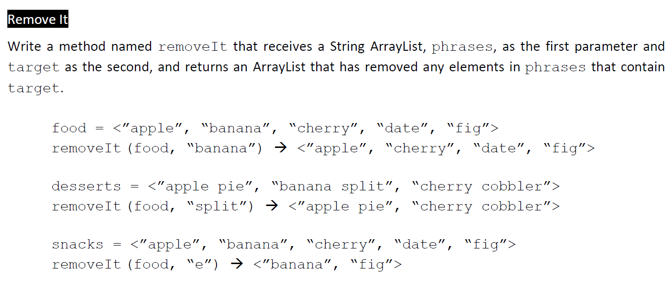 public static ArrayList<String> removeIt(ArrayList<String> phrases, String target) {