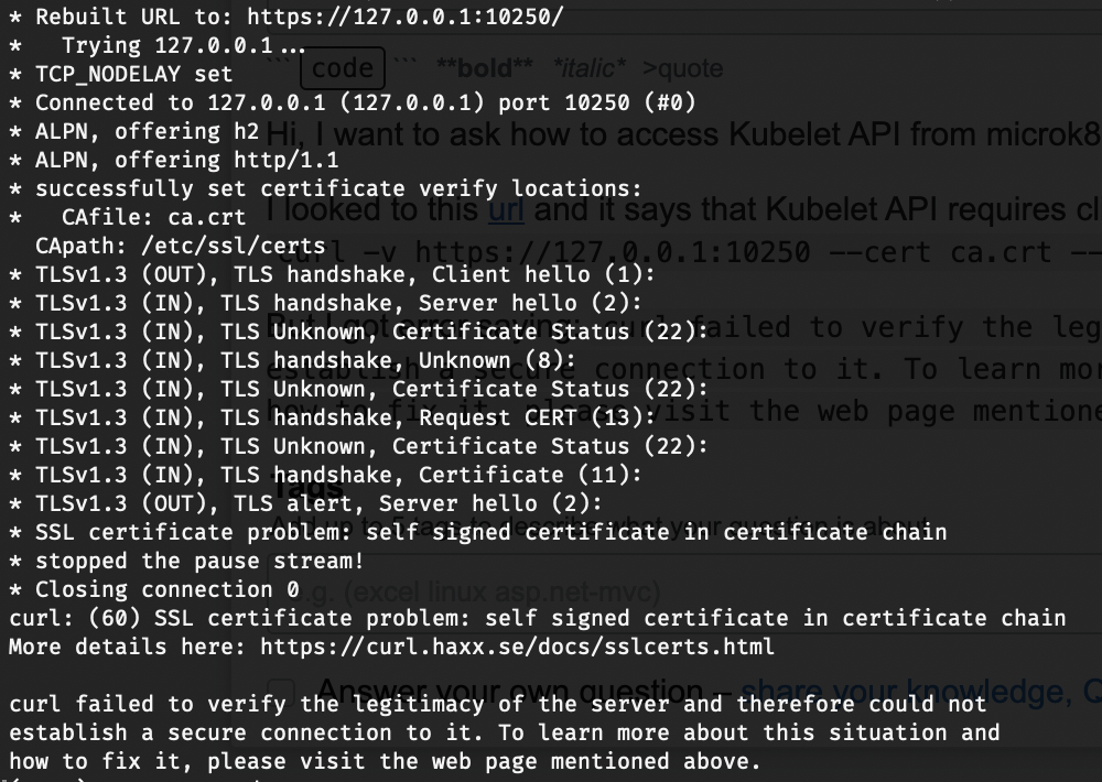 我查看了这个url,它说Kubelet需要客户端证书。因此,我调用了这个(从/var/snap/microk8s/current/certs) curl -v https://127.0.0.1:10250 --cert ca.crt --cert-type PEM --cacert ca.crt --key ca.key