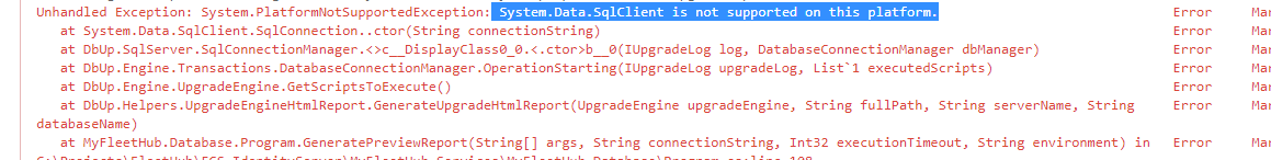 我在使用DBUP库的.net核心2.1项目,但是当我试图在八达通部署中运行DBUP时,迁移工具正在返回一个错误,在这个平台上不支持System.Data.SqlClient。