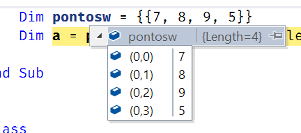 Dim pontosw As Integer(,) = {{7, 8, 9, 5}}但有时,让编译器隐式地决定会更容易。显然是整数