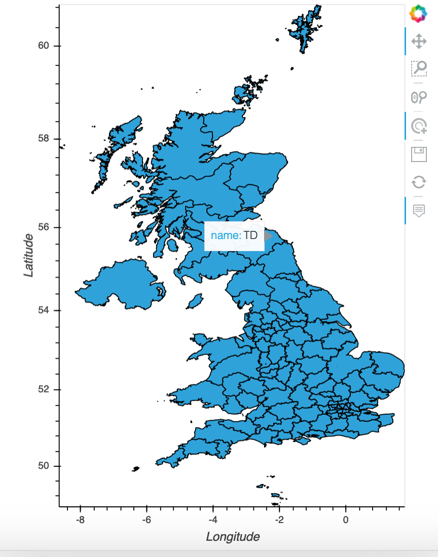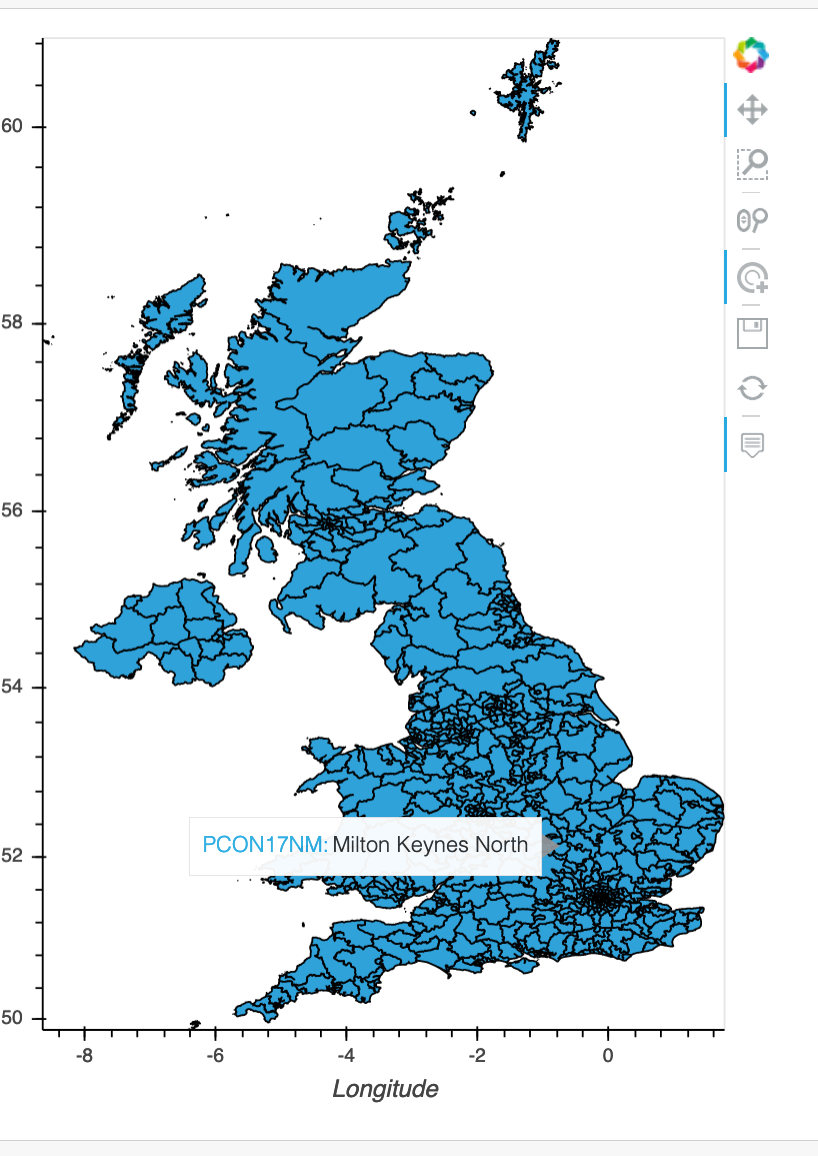 我有两个其他形状的文件(一个代表英国的邮政编码地区和一个由Parl选区)。在使用gv.Shape时,我不需要设置用于成功绘图的投影,这与我在最初的文章中讨论的投影不同。我还可以使用gv.Polygons成功地为这些人制作合唱: