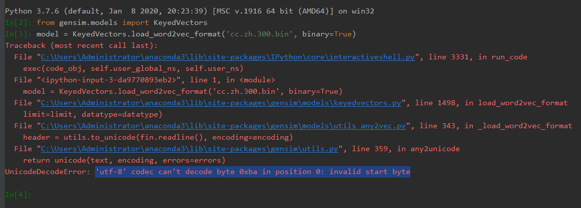 在尝试用gensim加载chines快速文本模型(cc.zh.300.bin)时,我遇到了以下错误