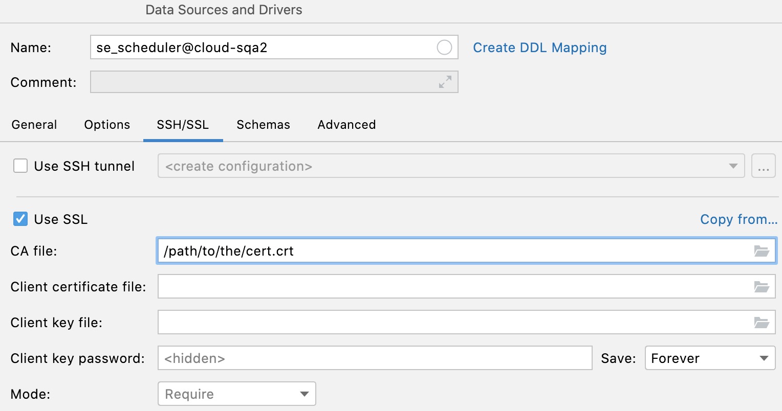 openssl s_client -connect example.com:1234 -servername example.com:1234 < /dev/null | sed -ne '/-BEGIN CERTIFICATE-/,/-END CERTIFICATE-/p' > cert.crt只需用主机和端口替换example.com:1234即可。数据库证书将保存为cert.crt。