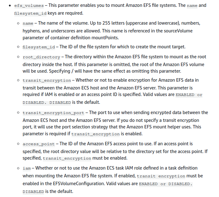 ECS/EFS文档说,要像这样配置任务定义,在ecs容器中挂载efs卷: