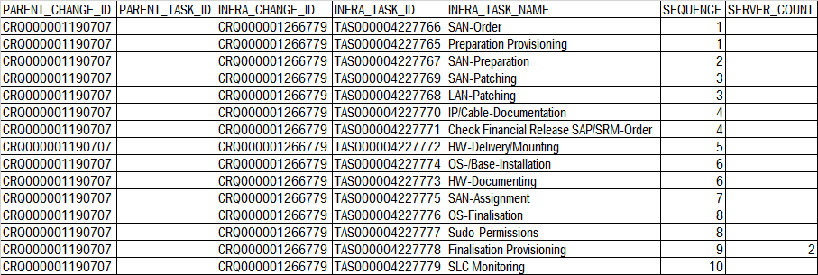 LEFT JOIN V_ITSM_REPORT_CHANGE_TASK_WI WI ON WI.TASK_ID = ICT.TASK_ID AND WI.SUMMARY='DBCPROVISIO'输出在下面