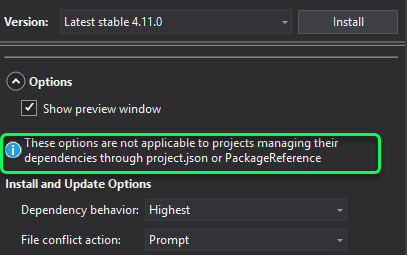 当我试图在Nuget中将依赖行为设置为最高时,我收到一条消息,即它不适用于使用PackageReference方法的项目: