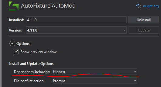 右击您的项目->Manage Nuget packages->将Dependency behavior更改为Options下的Highest,如上图所示。