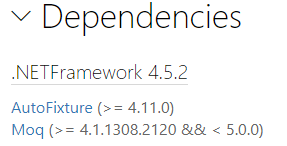 注意到,所有这些都是在包指定的依赖项范围内实现的。Moq (>= 4.1.1308.2120 && < 5.0.0)