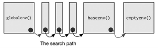 > 当R解释一个对象引用时,它首先查找当前环境(可能是全局环境中的一个封闭环境),然后导航父链,直到它在原始引用中找到一个具有名称的对象,或者到达空环境。在Advanced中,Hadley将搜索路径说明如下。