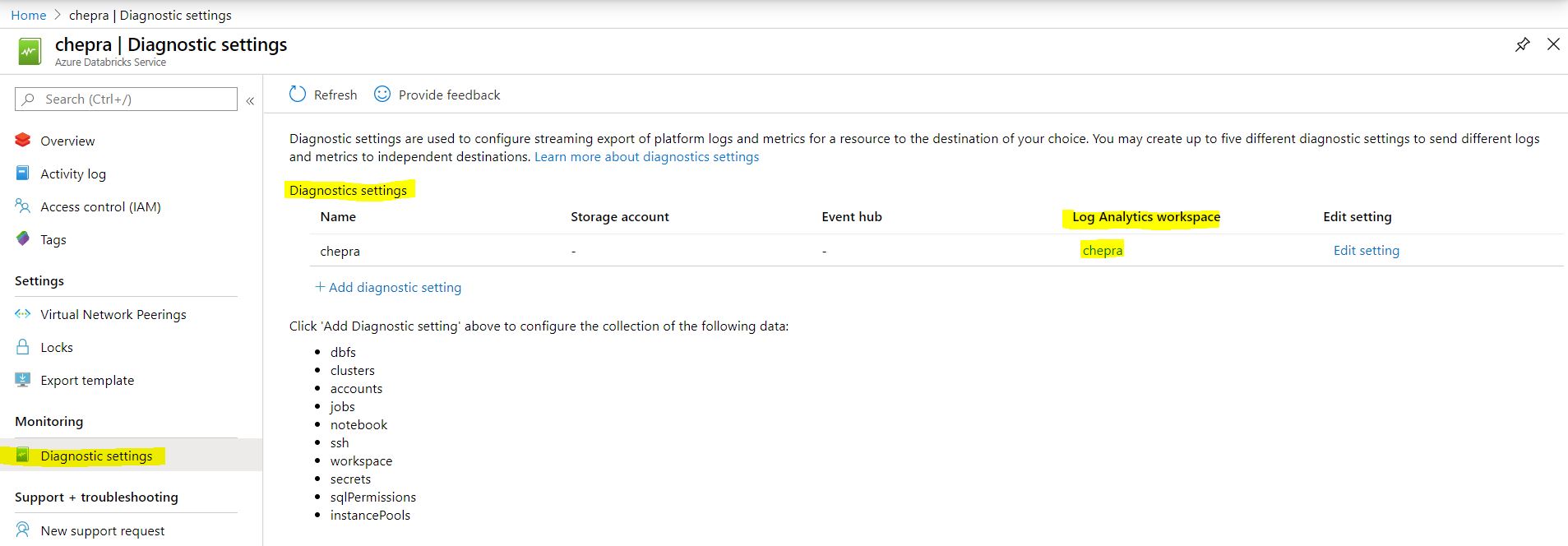 { dbfs, clusters, accounts, jobs, notebook,ssh, workspace, secrets, sqlPermissions, instancePools}STEP1:确保您已经配置了诊断设置。