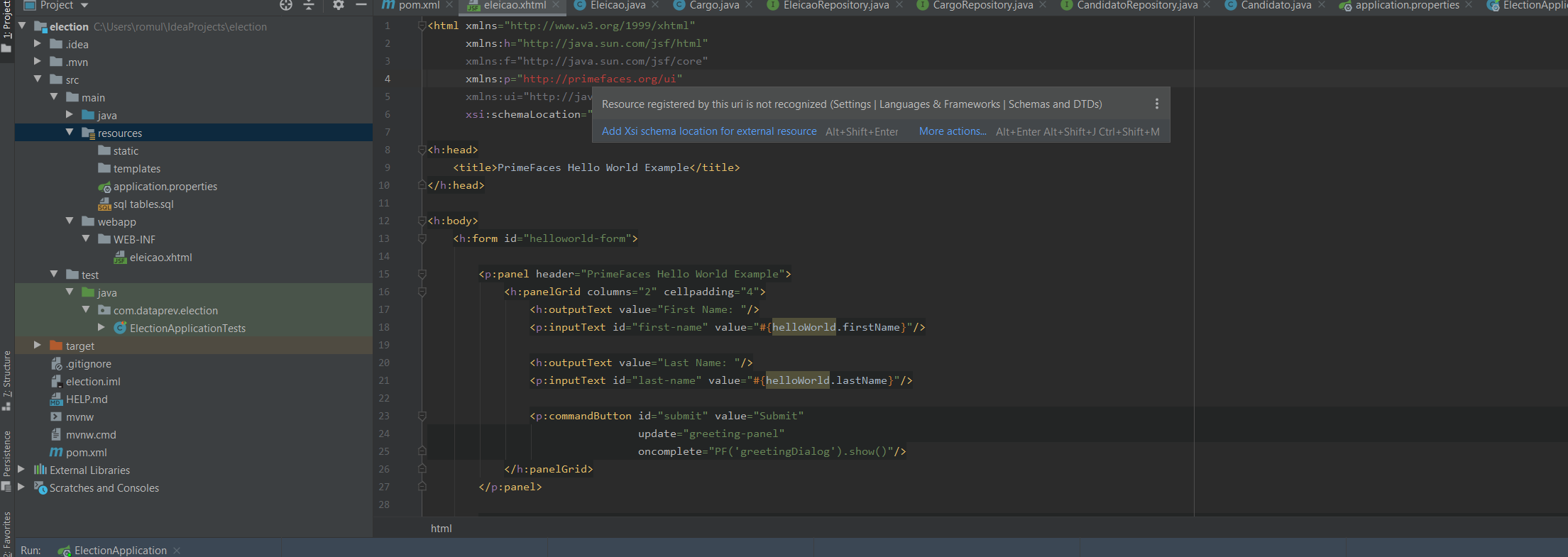 有一个意外的错误(type=Not Found,status=404)。/eleicao.xhtml未作为资源在ExternalContext中找到