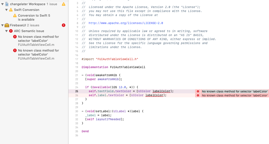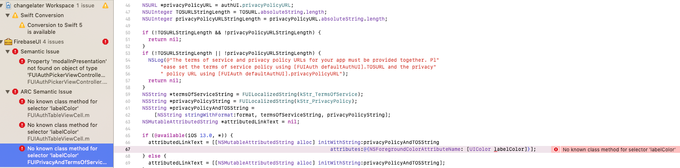 注意:我的xcode版本是10.3。似乎无论是关于if (@available(iOS 13.0, *))的地方,我都会收到这个错误。在我的podfile中,我不得不将一个版本强制放到其他的豆荚上,否则它会在任何与if (@available(iOS 13.0, *))相关的地方造成更多的错误。