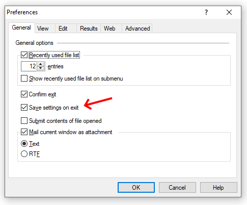 您对Preferences所做的任何更改都将在会话之间通过检查General: Save settings on exit来维护。未选中时,设置将是安装默认值或上次保存的设置。