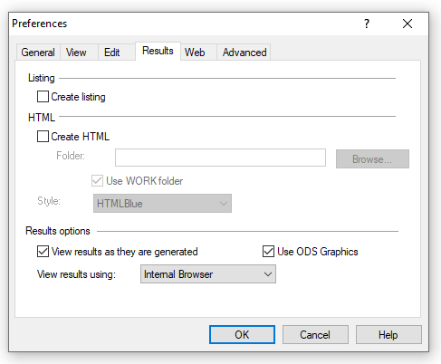 DM DLGPREFResults选项卡显示语句ODS PREFERENCES将重置为的会话设置。例如,我的当前设置没有选中Create HTML,但如果是,则该文件夹将是WORK文件夹。