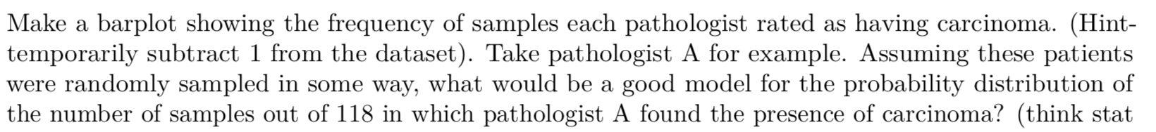 ?carcinoma根据帮助页面,这些数据代表了七位病理学家的二分评级。1=“否”和2=“是”。因此,减去1,然后取列和,就会给出每个病理学家的频率。