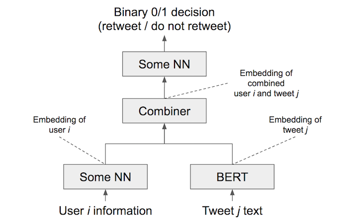 30 years old, photographer Teen movie was good N 如果您希望在没有用户个性化设置的情况下找到更简单的路径,那么只需删除创建用户i嵌入的组件即可。您可以使用BERT构建一个模型,以确定tweet是否被转发而不考虑用户。您可以再次遵循我上面提到的链接。