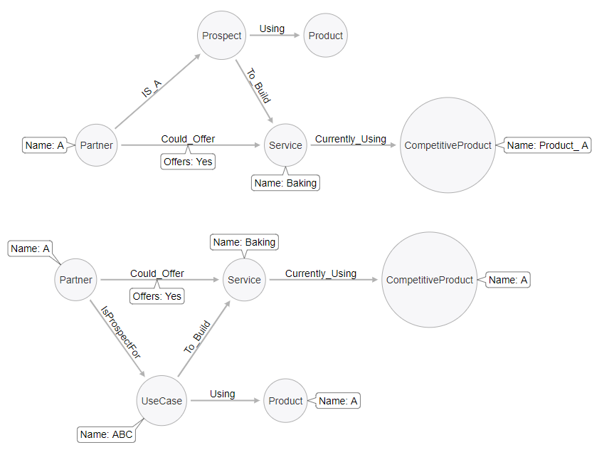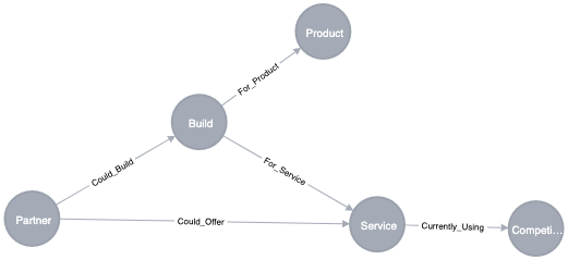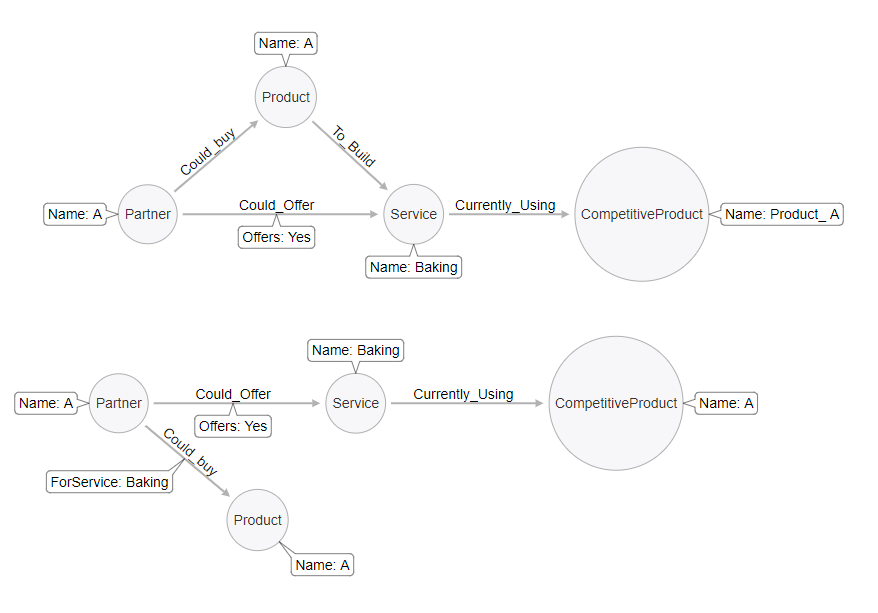 基本上,他们需要存储目前正在使用的信息,无论其目前是否由合作伙伴提供,他们仍然试图向他们出售产品(提供是或否仍然会导致市场)。服务和产品之间存在着多到多的关系,因为well...which意味着有一个“3节点”关系--一个特定产品的特定合作伙伴,用于特定服务,下面是我正在考虑的两个选项。选项1的问题是,产品A会有许多To_Build的外向关系,所以我没有办法找出它的哪个合作伙伴。