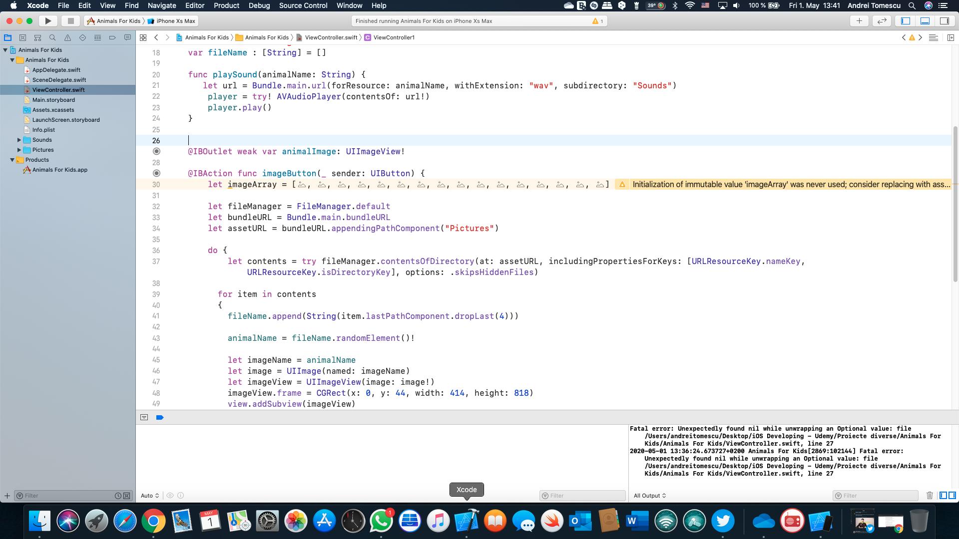 2020-05-01 12:21:31.111411+0200 Animals For Kids[1758:47571] Fatal error: Unexpectedly found nil while unwrapping an Optional value: file /Users/andreitomescu/Desktop/iOS Developing - Udemy/Proiecte diverse/Animals For Kids/Animals For Kids/ViewController.swift, line 21第21行的代码是: