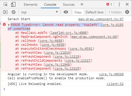 但是当我尝试实现@asymmetrik/ngx-leaflet和@asymmetrik/ngx-leaflet-draw之前所做的相同的代码时,它说的是一些错误:ERROR TypeError: Cannot read property 'topleft' of undefined。错误输出图像:
