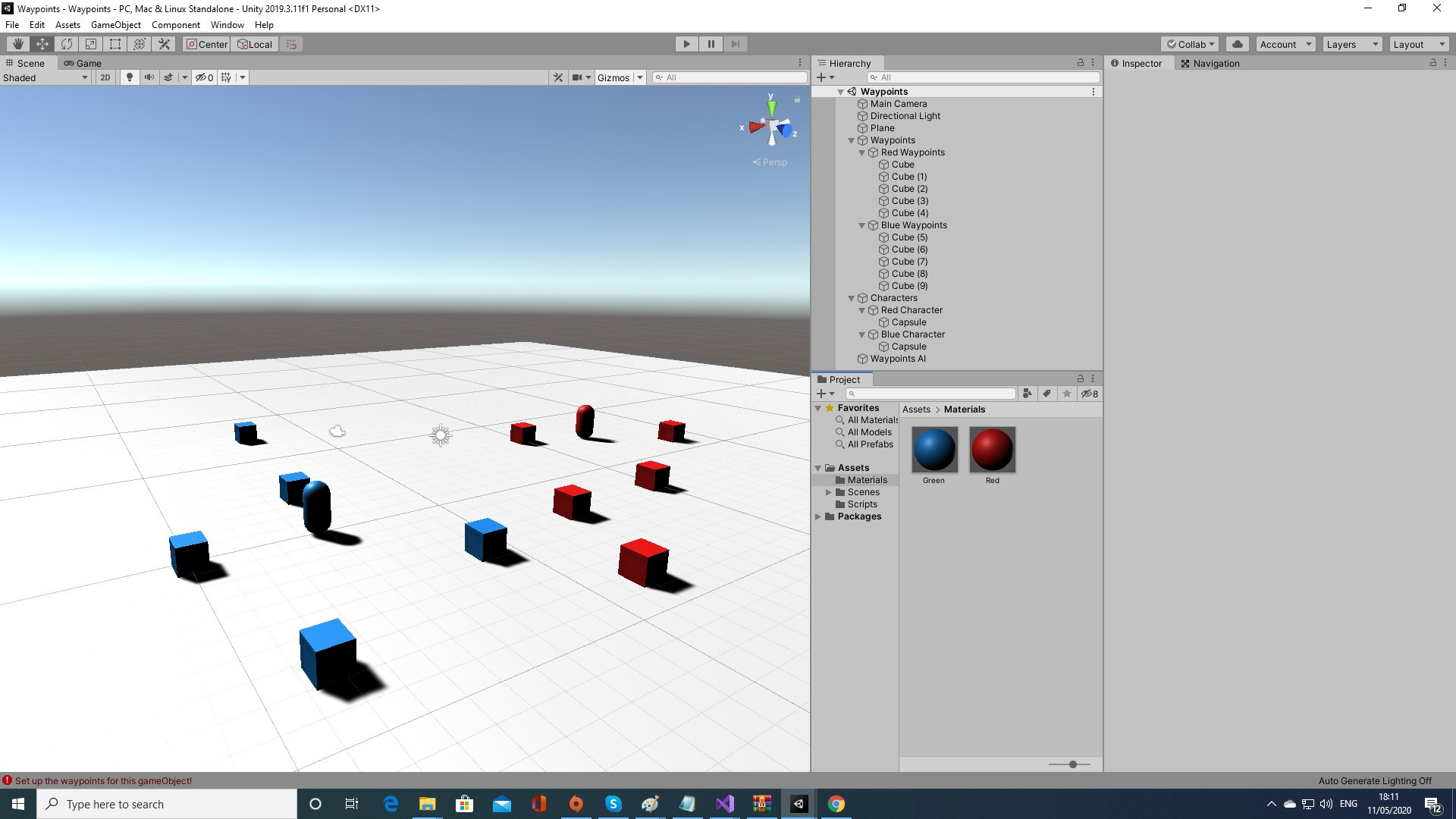 我想做的主要目标是使用相同的WaypointsAI脚本在蓝色路径点之间移动蓝色字符,并在红色路径点之间移动红色字符。如果蓝色组有5个字符,那么在蓝色路径点之间移动5个字符,如果红色组有50个字符,它们将在红色路径点之间移动。