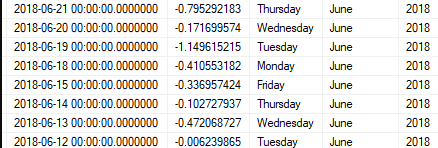 or date = dateadd(day, case when datename(dw, date) = 'Monday' then 3 else 1 end, lag_date)子查询对percent_gain为负值的行进行筛选,并使用lag()检索“上一行”的date。然后,外部查询再次根据以下条件进行筛选: