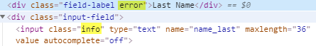 我想要使用css来针对每个有“错误”类的“信息”类,上面有两个div类。有办法用css做这件事吗?例如,如果上面的字段标签有"error“类,我希望"info”类具有红色边框。
