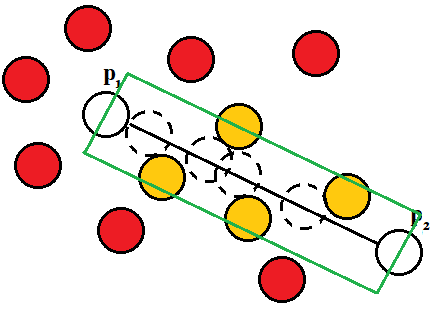 该矩形的短边通过P1-P2垂直于直线,分别穿过P1和P2中心。其长度为4x半径,线段中部为P1/P2。