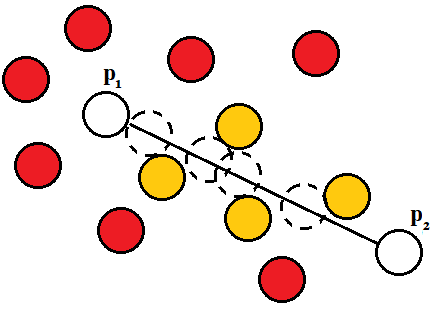 我试着迭代所有的球,把距离取到p1和p2形成的线,但是白色后面的球也变黄了,但它们不应该。我应该如何处理这个任务?有快速的方法吗?