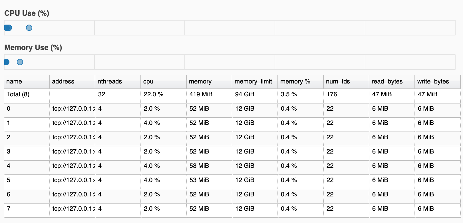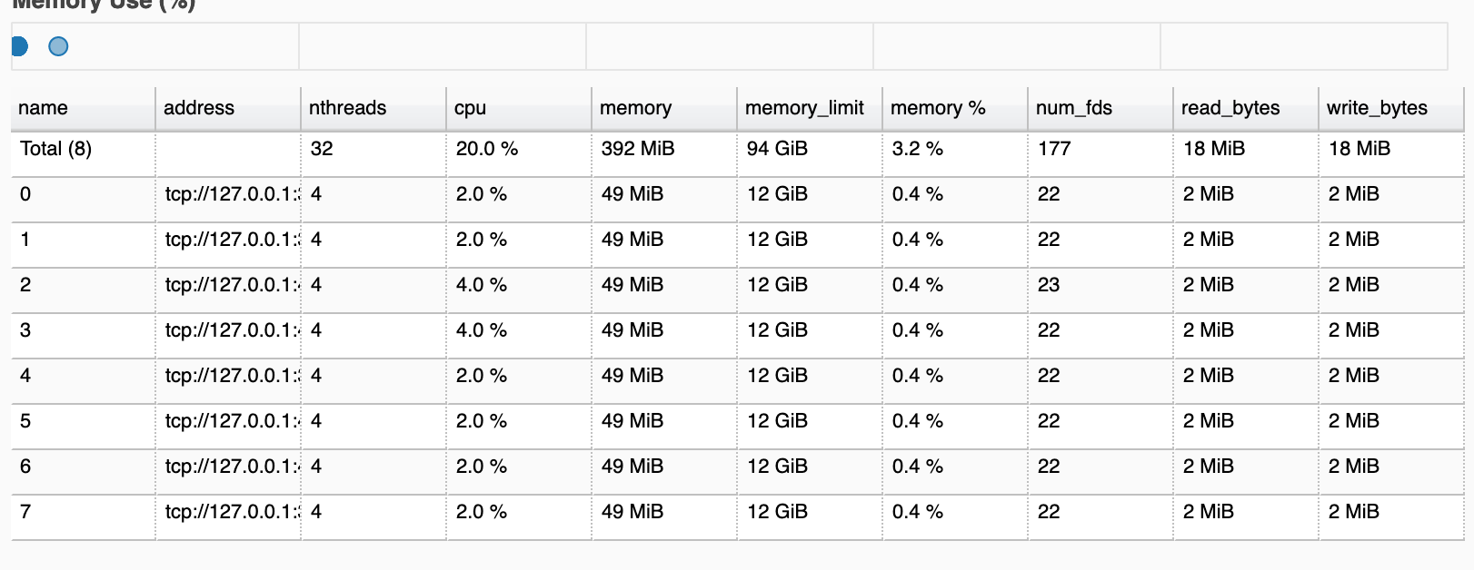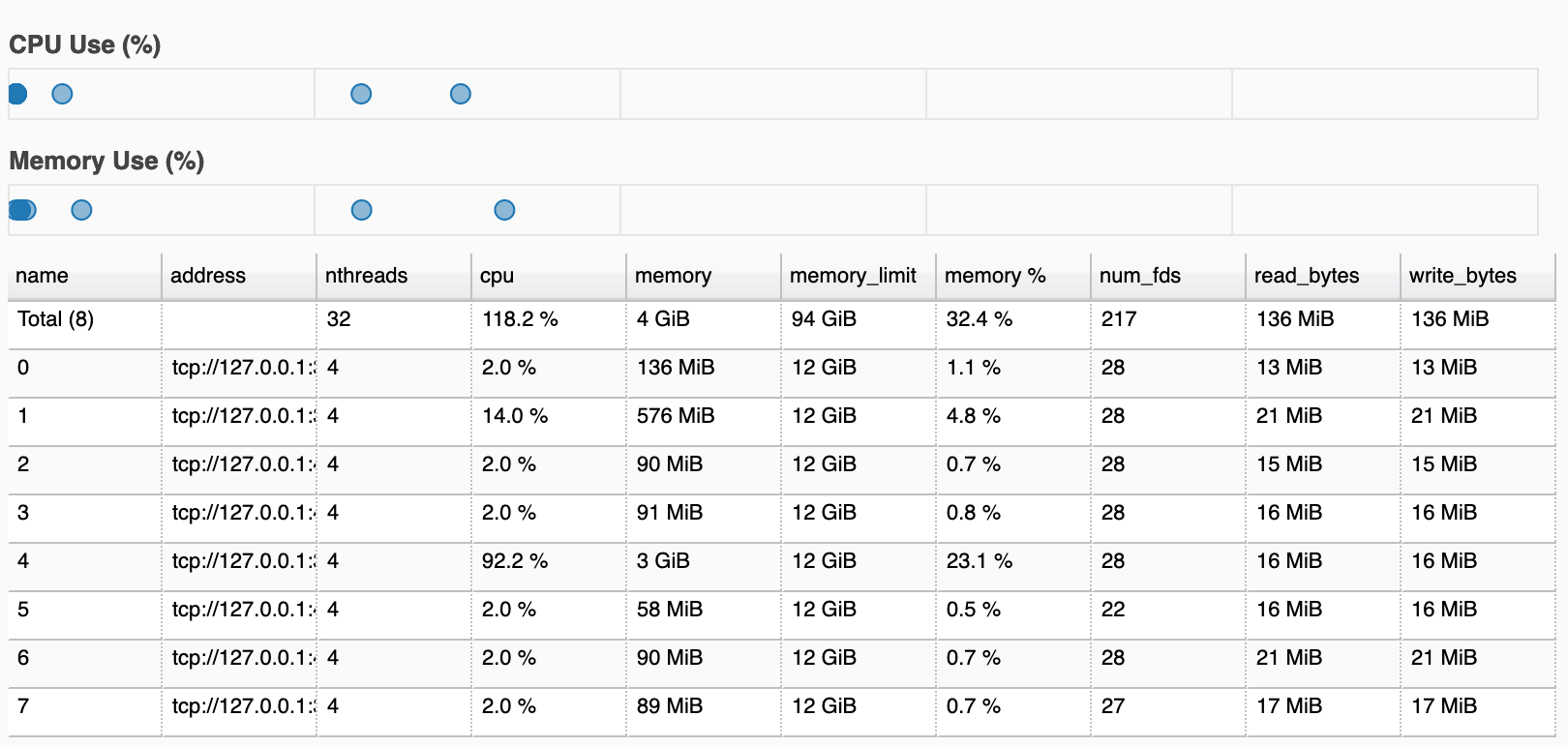 接下来,我在循环中调用futures.append(client.submit(fn, values)),然后调用client.gather(futures) --这是可行的!但是它没有假设的那么快,因为大多数计算/内存负载都集中在两个单进程 (worker4和worker 1)上:
