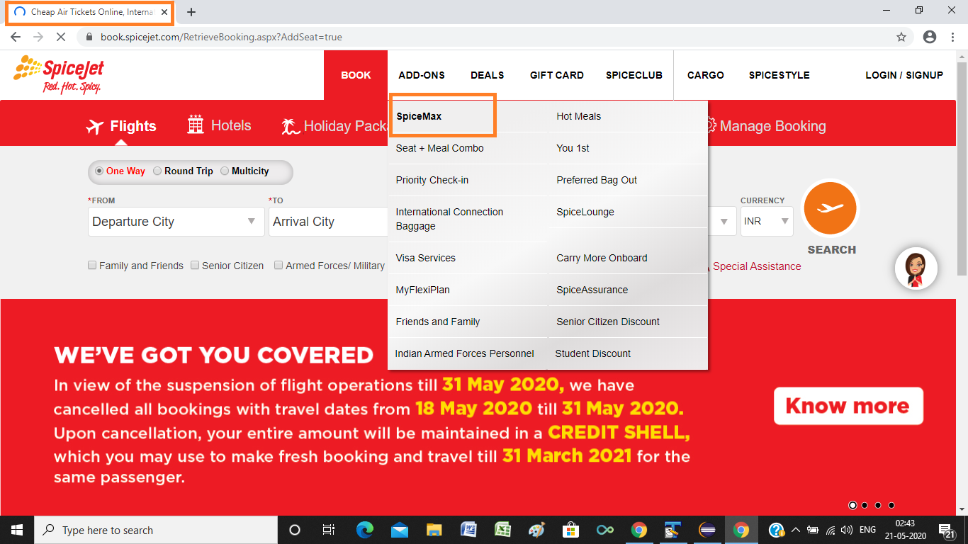 要演示使用Selenium在https://www.spicejet.com/中的ADD选项卡上使用鼠标Hover的功能,需要为visibilityOfElementLocated()诱导WebDriverWait,您可以使用以下Locator Strategy