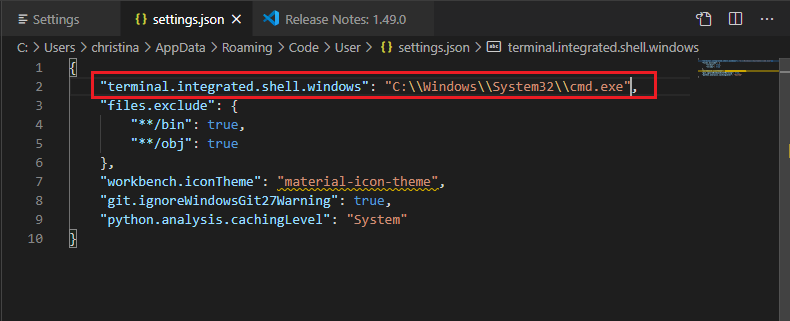 我也面临过同样的问题。您需要转到settings.json文件,将其编辑为"terminal.integrated.shell.windows":"C:\Windows\System32\cmd.exe“