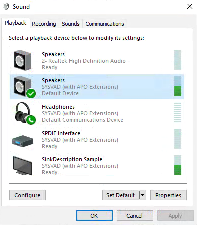 在目标计算机上找到一个MP3或其他音频文件,然后双击来播放它.然后在“声音”对话框中,验证与SYSVAD (带有APO扩展)驱动程序关联的卷级指示器中是否存在活动。