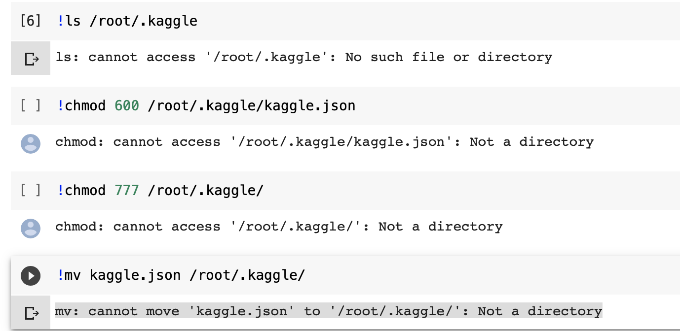 mv: cannot move 'kaggle.json' to '/root/.kaggle/': Not a directory错误截图(以获得更好的解释)