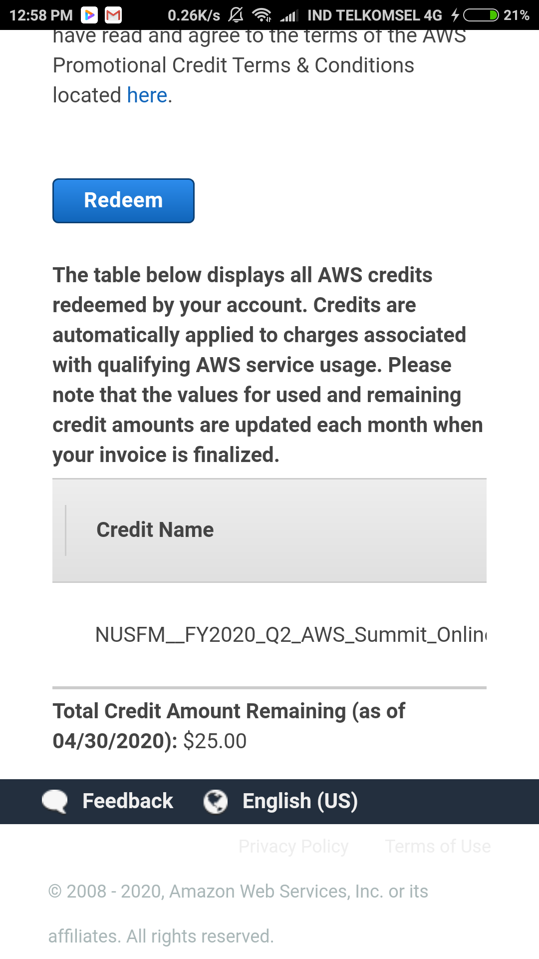 当我登录我的AWS帐户时,我已经赎回了它,现在我的帐户有了这样的信用: