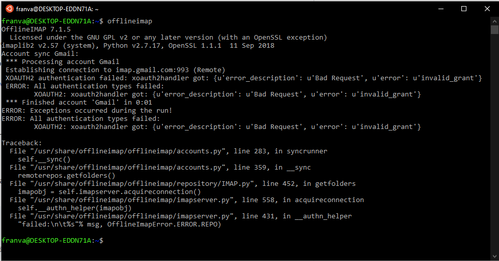 XOAUTH2: xoauth2handler got: {u'error_description': u'Bad Request', u'error': u'invalid_grant'}