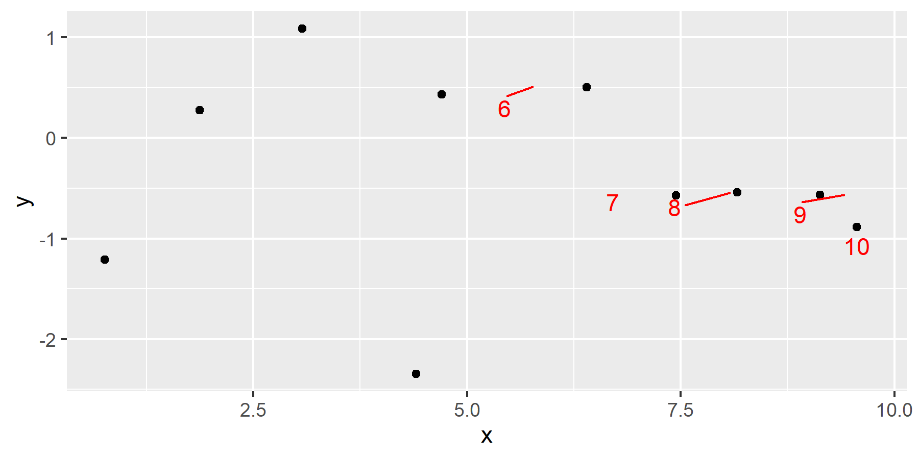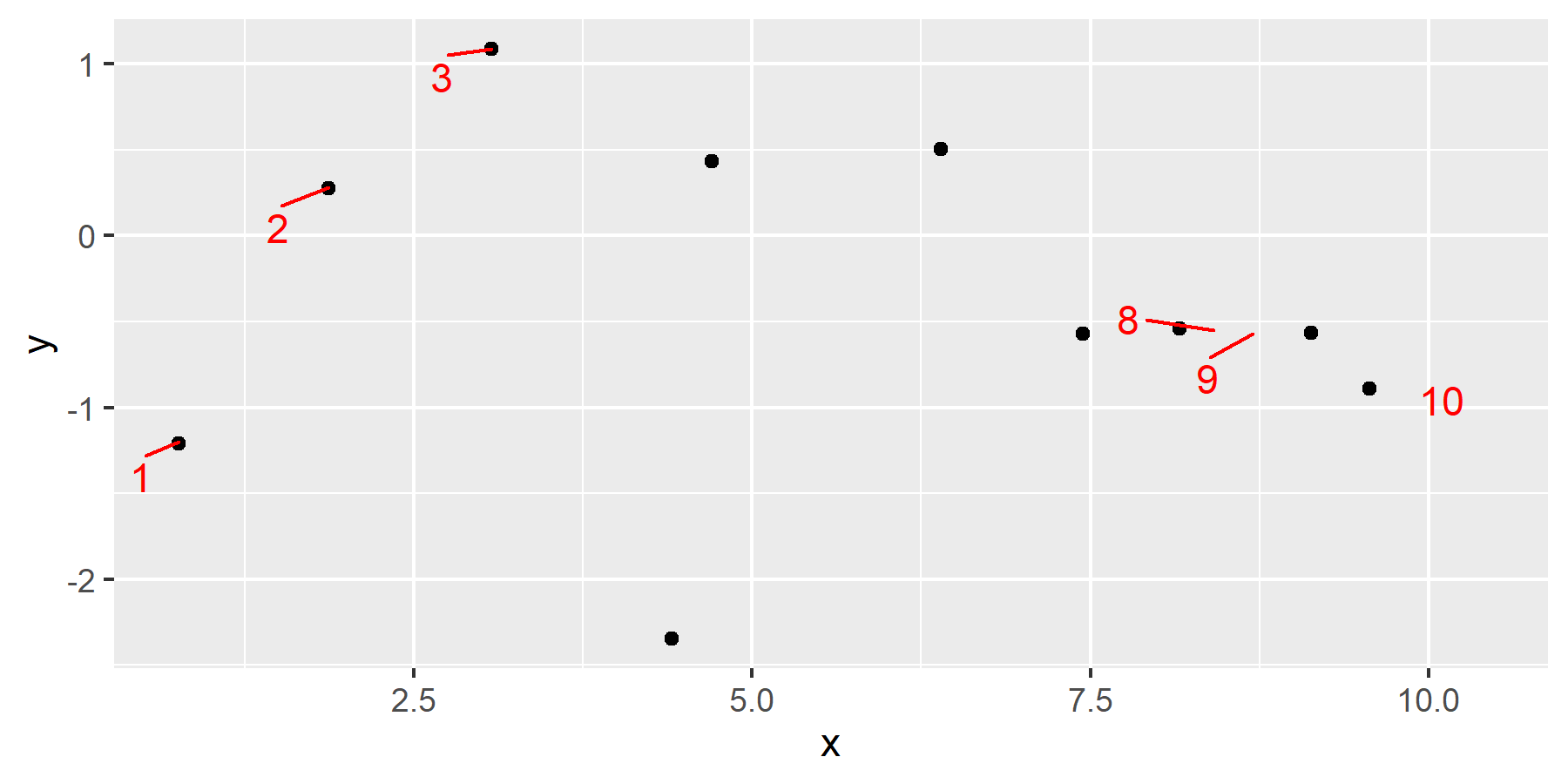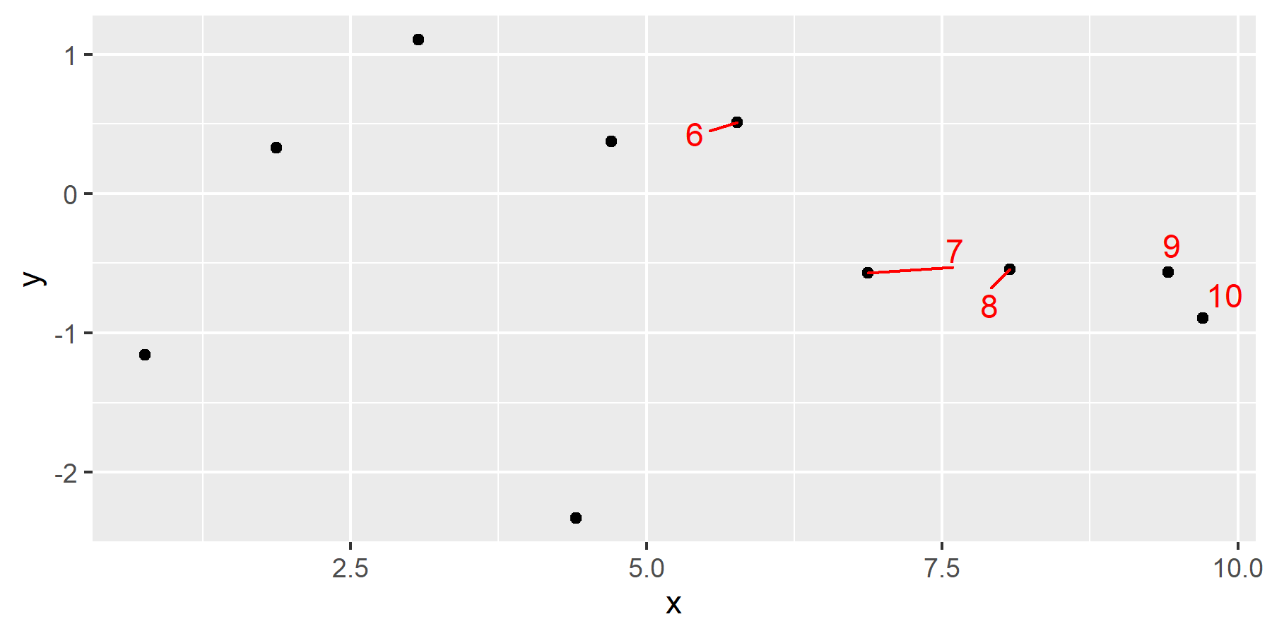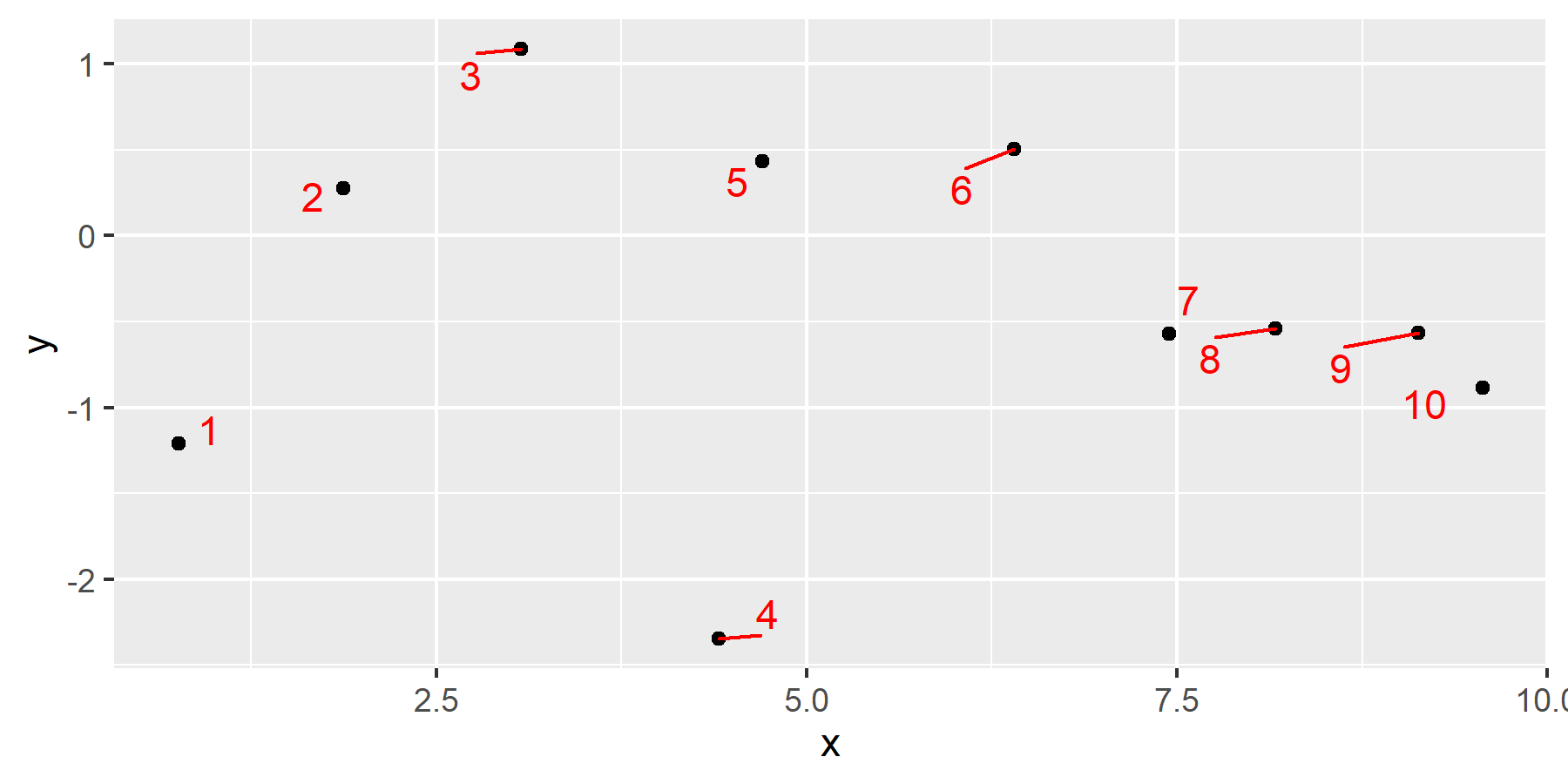 df <- data.frame(x=1:10, y=rnorm(10))我将绘制数据集,并将预先创建的position_jitter()对象应用于geom_point()和geom_text_repel()。您将看到输出图中的所有段都与所期望的点匹配。