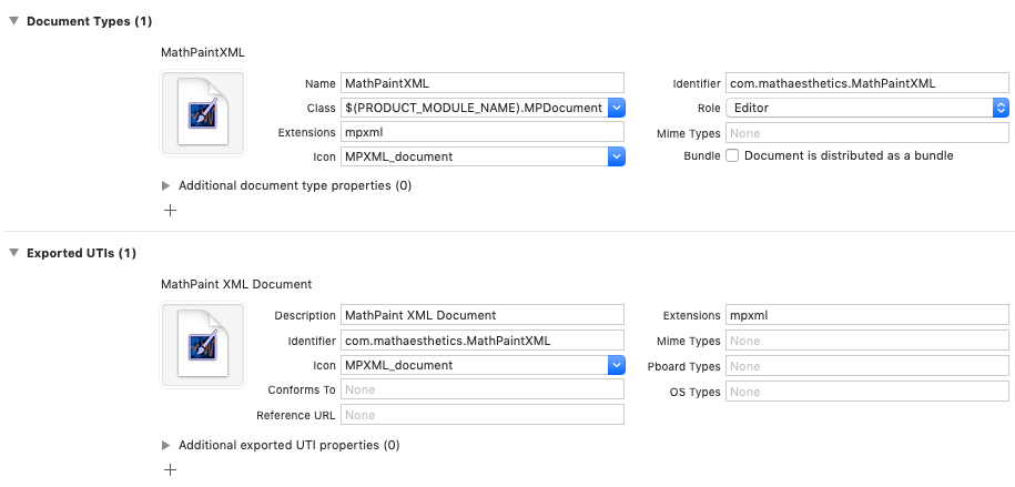 我有一个基于NSDocument的Mac应用程序,用Swift,Xcode 11编写,它读写一个带有后缀"mpxml“的自定义文档类型。