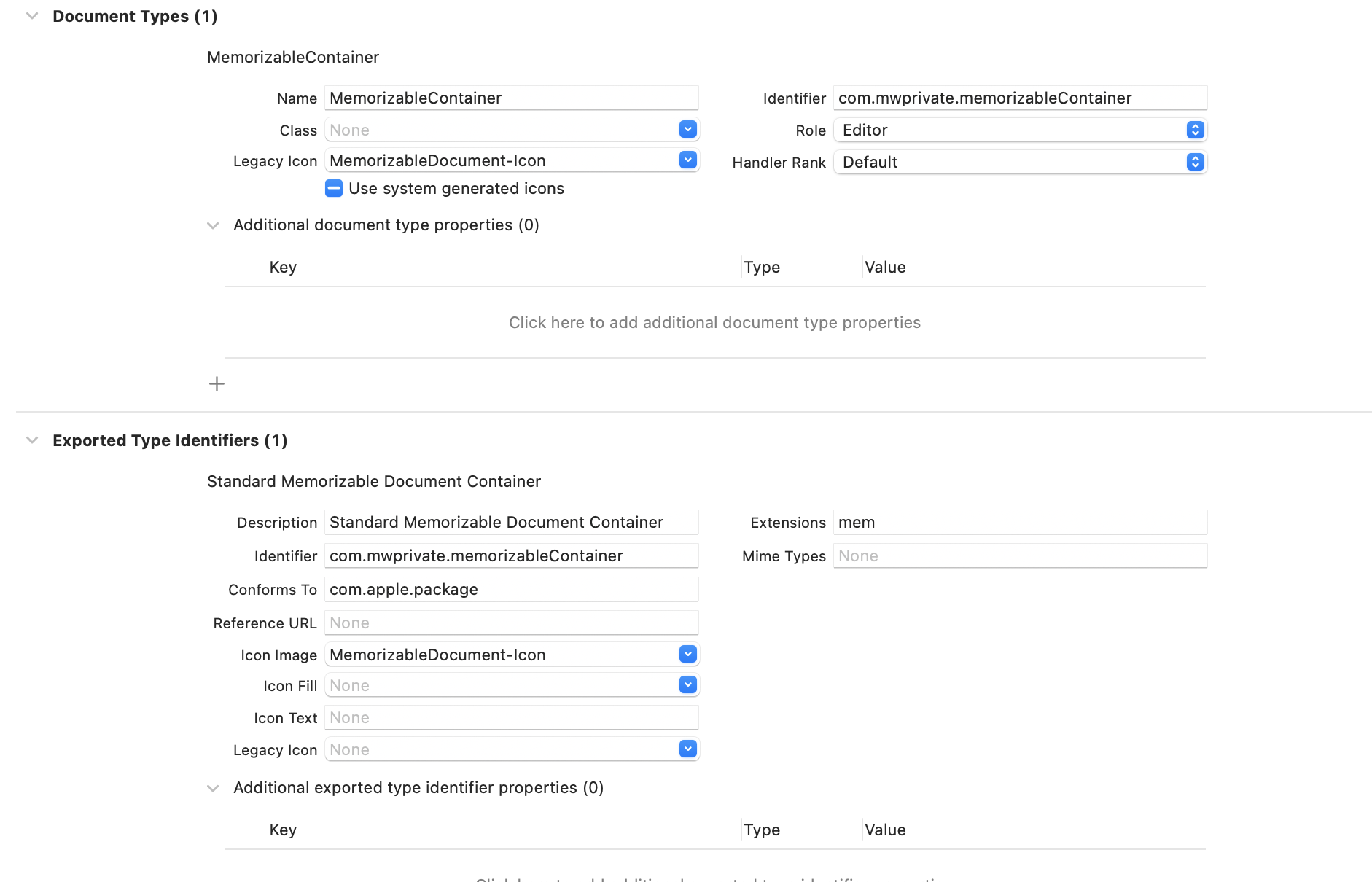 在没有自定义UTI声明的项目的原始形式中,Info.plist文档类型声明是: